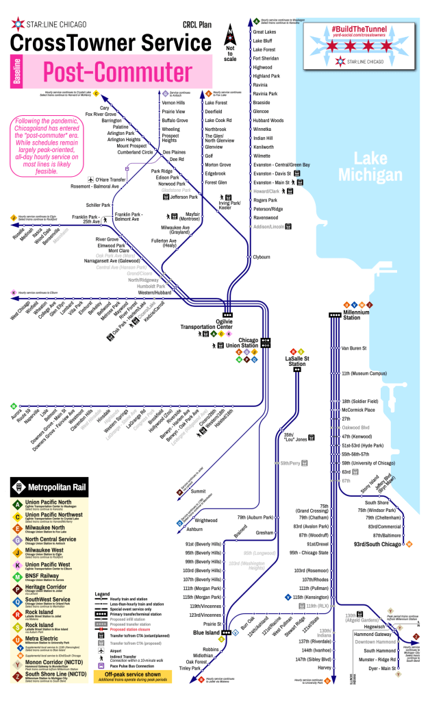 We begin with the โPost-Commuterโ era: Metra has already committed to transitioning their fundamental operating model from โcommuter railโ to โregional railโ. Preliminarily, this can be best summarized as โhourly everywhereโ: while some level of peak-period focus is warranted based on present ridership, the larger goal is to provide bi-directional all-day service throughout the service area. At present, Metra has been actively moving towards hourly headways wherever possible.