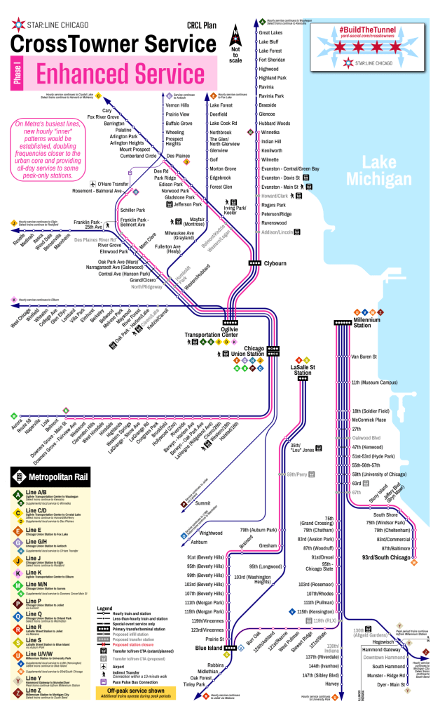 The tunnel would greatly enhance regional intermodal connectivity with stations at Randolph/Clinton (connecting to Green and Pink Line โLโ trains at the existing Clinton/Lake station and Metra trains at Ogilvie), Chicago Union Station (connecting to Blue Line โLโ trains at the existing Clinton/Congress station as well as Amtrak, Metra, X5 and X6 trains at the station), Taylor/Clinton (to seed a new transit-oriented development neighborhood), and Roosevelt (connecting to Red, Orange, and Green Line โLโ trains at the existing Roosevelt station).