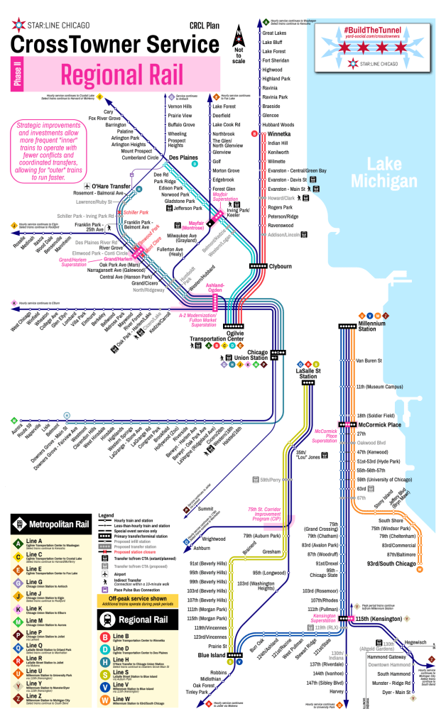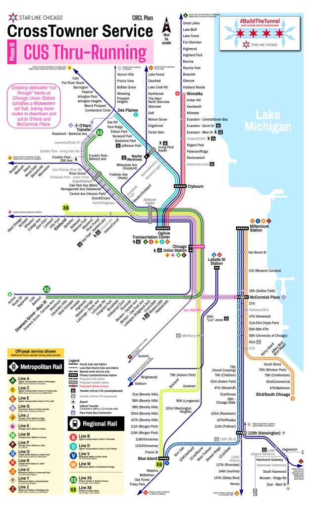 The larger regional CrossTowner network starts to take shape in Phase III, when dedicated thru-running tracks at Chicago Union Station are constructed. This improvement can allow for proper thru-running operations at Chicago Union Station for regional rail service at higher frequencies. Combined with Amtrakโs Chicago Hub Improvement Program (CHIP), three primary routes could be implemented: