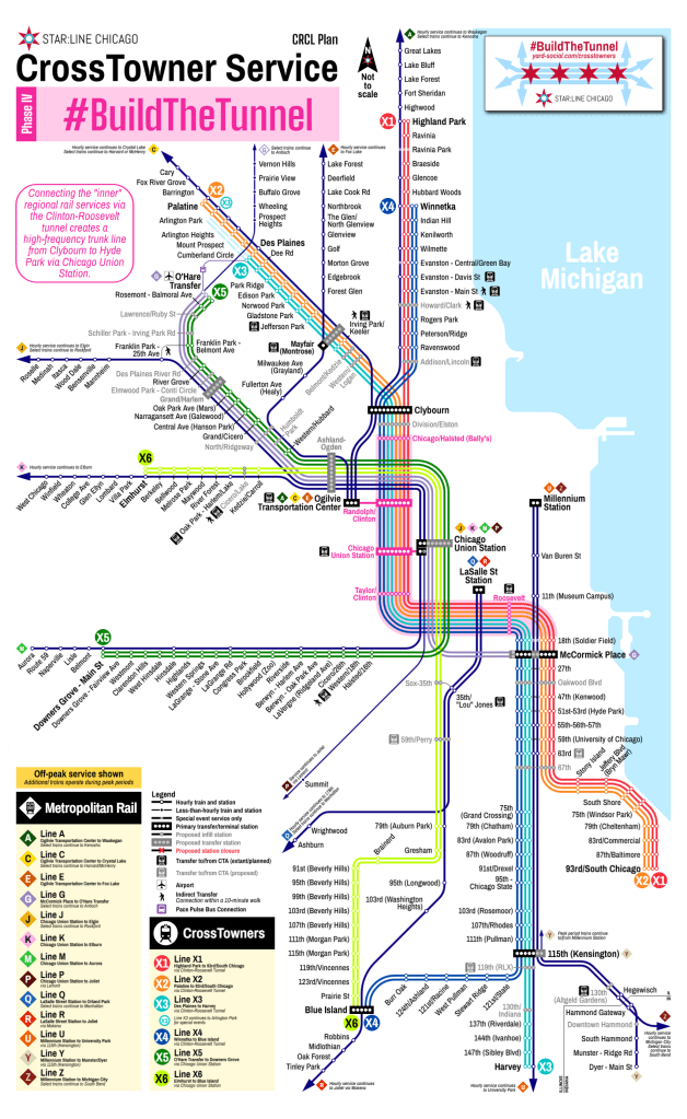 By the time we get to building the tunnel, operationally it ends up being an extremely straightforward enhancement. The tunnel gets built under Clinton Street and Roosevelt Road, and each of the four remaining regional rail lines (โBโ, โDโ, โVโ, and โWโ) simply continue through the tunnel and out to regional rail lines on the other side as CrossTowners. Doing so halves headways on the rest of the regional rail network, while expanding half-hourly service further out into the suburbs. Within the tunnel itself, and indeed down the entire โtrunkโ between Clybourn and Hyde Park, CrossTowner trains now operate every 7.5 minutes, and every 15 minutes as far as Kensington, South Chicago, Winnetka, and Des Plaines.