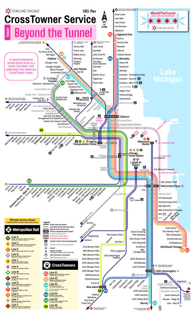While the initial vision would be complete, that doesnโt mean there wouldnโt be additional opportunities for expansion. With no freight conflicts on the Metra Electric District, additional regional rail routes could be added later; more frequent service to OโHare, or expanding regional rail to the Milwaukee North, or entirely new services could be added in the future. The original 2034sight Plan calls for a tunnel under Ohio Street and Columbus Drive, a corridor that remains ideal for additional high-frequency, high-capacity transit options to serve River North, Streeterville, and Lakeshore East. This alignment could also provide single-seat trips from the Far South Side to OโHare more feasibly, and closer to downtown the Ohio-Columbus tunnel is bookended at each end by โsuperstationsโ to provide universal connectivity between lines as needed. Rather than precluding these service alternatives, the CrossTowner vision is intentionally open-ended and forward-compatible for the continued growth of Chicagolandโs transit network.